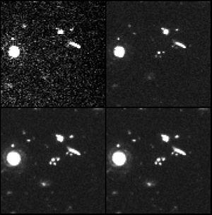 Scattered light from the Earth was evident in about a quarter of the data frames, creating a visible "X" pattern on the images. This was removed by taking an image affected by scattered light, aligning it with an unaffected image, and subtracting the unaffected image from the affected one. The resulting image was smoothed, and could then be subtracted from the bright frame. This procedure removed almost all of the scattered light from the affected images.[6]
