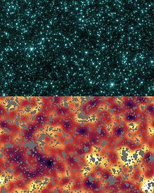 Another important result from the HDF was the very small number of foreground stars present. For years astronomers had been puzzling over the nature of dark matter, mass which seems to be undetectable but which observations implied made up about 85% of all matter in the Universe by mass.[18] One theory was that dark matter might consist of Massive Astrophysical Compact Halo Objects (MACHOs)—faint but massive objects such as red dwarfs and planets in the outer regions of galaxies.[19] The HDF showed, however, that there were not significant numbers of red dwarfs in the outer parts of our galaxy.[10][12]