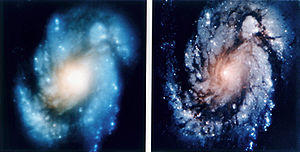 After the spherical aberration was corrected during Space Shuttle mission STS-61 in 1993,[4] the improved imaging capabilities of the telescope were used to study increasingly distant and faint galaxies. The Medium Deep Survey (MDS) used the Wide Field and Planetary Camera 2 (WFPC2) to take deep images of random fields while other instruments were being used for scheduled observations. At the same time, other dedicated programs focused on galaxies that were already known through ground-based observation. All of these studies revealed substantial differences between the properties of galaxies today and those that existed several billion years ago.[5]