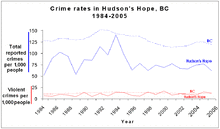 In 2005, the three officer Hudson's Hope Royal Canadian Mounted Police detachment reported 102 Criminal Code offences, down from 124 in 2004. This translated into a crime rate of 62 Criminal Code offences per 1,000 people, lower than the provincial rate of 125. In 2004, the only Criminal Code categories in which Hudson's Hope had a higher than average reported crime rate was in non-sexual assaults at 14.3 reported cases per 1,000 people (9.9 provincially), sexual assaults at 1.2 (0.88 provincially), impaired driving at 6.2 (3.2 provincially), and cannabis-related crimes at 5.5 (4.2 provincially). All other Criminal Code categories were lower for Hudson's Hope compared to the provincial averages, especially for motor vehicle thefts, at only 2.5 per 1,000 people (provincial average was 8.9), thefts from motor vehicles at 1.9 (20.2 provincially), and residential break-and-enters at 1.9 (6.0 provincially).[23]