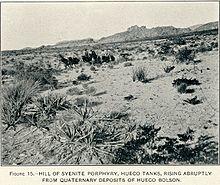 The syenite pluton was formed 34-38 million years ago, as part of a larger range, the Hueco Mountains, which range in age to over 320 million years ago, when this area was covered by an inland sea. The pluton was eventually exposed through weathering to form the rock formations visible today, which jut from the desert floor. The tanks were once capable of containing a year's supply of water.[9] In addition to the tanks, there are several permanent springs and seasonal springs in the area.[25] The area receives less than 14 inches (360 mm) of rainfall a year.[26]