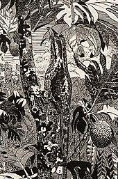 Cott possessed considerable artistic skill. Like Abbott Thayer, he used his artistry in his scientific work, including in Adaptive Coloration in Animals, to help argue the case he was making.[22] For example, his black-and-white potoo shows this rainforest bird sitting motionless on a mottled tree trunk, its behaviour and disruptive pattern combining to provide effective camouflage. The philosopher and jazz musician David Rothenberg wrote of Cott's art:[26]