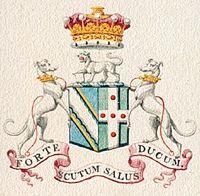 Heraldic achievement of Hugh Fortescue, 1st Earl Fortescue, showing arms of Fortescue impaling Grenville, c.1800, Possibly from a bookplate: Baron: Azure, a bend engrailled argent plain cottised or; Femme: Vert, on a cross argent five torteaux. The Latin motto of Fortescue is shown beneath: Forte Scutum Salus Ducum ("A Strong Shield is the Salvation of Leaders")[1]
