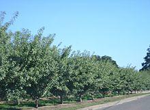 Hughson is surrounded by orchards and has been a long-time farming community. Initially, it was known for its enormous production of peaches, which garnered the area the title "The Peach Capital of the World". Peaches are no longer the primary crop in the area and have been replaced for the most part by almond trees. Almond production in the area is one of the largest in the world. The crops grown in Hughson include almonds, peaches, walnuts, nectarines, cherries, apples, and the occasional vineyard.