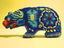 The beaded art is a relatively new innovation and is constructed using glass, plastic or metal beads pressed onto a wooden form covered in beeswax. Common bead art forms include masks, bowls and figurines. Like all Huichol art, the bead work depicts the prominent patterns and symbols featured in the Huichol religion.