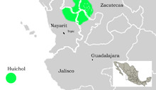 The Wixárika arrived in the Bolaños Canyon region after the arrival of the Tepehuanes. There are numerous theories among anthropologists and historians about the timing of the arrival of this ethnic group in the region, but according to Wixárika oral history, when they arrived in the region they currently consider home, the region was already inhabited by another ethnic group. Tepecano oral history also confirms that villages currently inhabited by Wixárika, such as Santa Catarina, were Tepecano villages in the past.[4] In addition, there exist no stories of conquest or domination of the Wixárika by the Tepecanos in regarding the origin of Wixárika is that they come from the region of San Luis Potosí and that before their migration to the Bolaños Canyon region, they considered themselves part of the Guachichil ethnic group. Central to the traditional religion of the Wixárika is the gathering of hikuri (a hallucinogenic cactus) in the place that they call Wirikuta, that is located in the region of Real de Catorce in the state of San Luis Potosí. Hikuri does not grow in the region of Wixárika, but it is abundant in San Luis Potosí, territory that was at the center of the dominion of the Guachichiles before the arrival of the Spaniards. The Guachichiles were known to be bellicose and fiercely defensive of their territory.[5] It is unlikely that the Guachichiles would have let the Wixárika pass peacefully through their territory to gather peyote unless they recognized them as part of their own ethnic group. This is confirmed by oral history of Wixárika,[6] as well as the similarity between the language of Wixárika and the extinct language of the Guachichiles compared to their present neighbors, the Cora.[7]