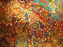 For the Huichol however, yarn painting is not only an aesthetic or commercial art form; the symbols in these paintings are sprung out of Huichol culture and its shamanistic traditions. From the small beaded eggs and jaguar heads to the modern detailed yarn paintings in psychedelic colors, each is related to a part of Huichol tradition and belief. In more modern times they have been able to develop these art forms in ways they could not before. The colors and intricacy of the yarn and materials for beads are more readily available to make more detailed and colorful pieces of art. Previously, beaded art was made with bone, seeds, jade, ceramics, or other like materials when now the Huichols have access to glass beads of multiple colors. The modern yarn that Huichols use is woven much tighter and is thinner allowing for great detail and the colors are commercial allowing for much more variety. Before access to these materials in cities, Huichols used vegetable dyes.[32]