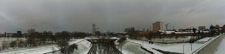 Hulme is south of Manchester city centre, beyond the River Medlock. The part of Hulme nearest to Old Trafford is known as Cornbrook from the Corn Brook, a tributary of the River Irwell. The area adjacent to Castlefield is known as St Georges. This area is named after the Church of St George, Chester Road. The Bridgewater Canal passes through Hulme.