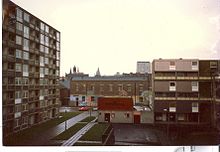 In Hulme, a new and (at the time) innovative design for deck access and tower living was attempted with four blocks, designed for families. This consisted of curved rows of low-rise flats with deck access far above the streets, known as the Hulme Crescents, designed to house 13,000.[21] In this arrangement, vehicles remained on ground level with pedestrians on concrete walkways overhead, above the smoke and fumes of the street. People living in the new post war council homes were, within a decade treated as second class citizens.[22]