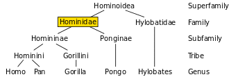 Within the superfamily Hominoidea, the family Hominidae diverged from the family Hylobatidae some 15–20 million years ago; subfamily Homininae (African apes) diverged from Ponginae (orangutans[a]) about 14 million years ago; the tribe Hominini (including humans, Australopithecus, and chimpanzees) parted from the tribe Gorillini (gorillas) between 8–9 million years ago; and, in turn, the subtribes Hominina (humans and extinct biped ancestors) and Panina (chimpanzees) separated 4–7 million years ago.[8]