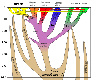 The hypothesis of interbreeding, also known as hybridization, admixture or hybrid-origin theory, has been discussed ever since the discovery of Neanderthal remains in the 19th century.[120] The linear view of human evolution began to be abandoned in the 1970s as different species of humans were discovered that made the linear concept increasingly unlikely. In the 21st century with the advent of molecular biology techniques and computerization, whole-genome sequencing of Neanderthal and human genome were performed, confirming recent admixture between different human species.[92] In 2010, evidence based on molecular biology was published, revealing unambiguous examples of interbreeding between archaic and modern humans during the Middle Paleolithic and early Upper Paleolithic. It has been demonstrated that interbreeding happened in several independent events that included Neanderthals and Denisovans, as well as several unidentified hominins.[121] Today, approximately 2% of DNA from all non-African populations (including Europeans, Asians, and Oceanians) is Neanderthal,[122] with traces of Denisovan heritage.[123] Also, 4–6% of modern Melanesian genetics are Denisovan.[123] Comparisons of the human genome to the genomes of Neandertals, Denisovans and apes can help identify features that set modern humans apart from other hominin species. In a 2016 comparative genomics study, a Harvard Medical School/UCLA research team made a world map on the distribution and made some predictions about where Denisovan and Neanderthal genes may be impacting modern human biology.[124][125]