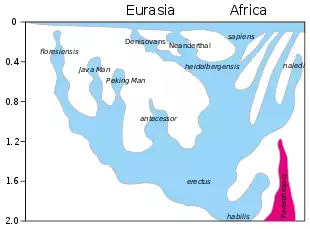 A major problem in the 19th century was the lack of fossil intermediaries. Neanderthal remains were discovered in a limestone quarry in 1856, three years before the publication of On the Origin of Species, and Neanderthal fossils had been discovered in Gibraltar even earlier, but it was originally claimed that these were the remains of a modern human who had suffered some kind of illness.[61] Despite the 1891 discovery by Eugène Dubois of what is now called Homo erectus at Trinil, Java, it was only in the 1920s when such fossils were discovered in Africa, that intermediate species began to accumulate.[62] In 1925, Raymond Dart described Australopithecus africanus.[63] The type specimen was the Taung Child, an australopithecine infant which was discovered in a cave. The child's remains were a remarkably well-preserved tiny skull and an endocast of the brain.