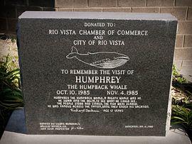 As they approached the San Francisco Bay and the water gained in salinity, Humphrey became visibly excited and began sounding. Though the crew lost sight of him that night, they picked him back up in the morning and led him out through the Golden Gate bridge into the Pacific Ocean on November 4, 1985, at 4:36 p.m.[9] The town of Rio Vista later erected a commemorative granite marker at City Hall at the east end of Main Street.[7][10] A since closed restaurant in Pittsburg was named Humphrey's in the whale's honor.[11]