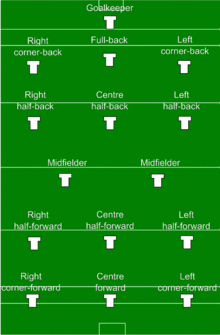 Teams consist of fifteen players: a goalkeeper, three full backs, three half backs, two midfielders, three half forwards and three full forwards (see diagram). The panel is made up of 24–30 players and five substitutions are allowed per game. An exception can now be made in the case of a blood substitute being necessary.