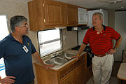 On August 11, Florida governor Jeb Bush issued a state of emergency declaration due to the impending threat Charley presented to the state while the storm was still located south of Jamaica.[11] The National Hurricane Center issued hurricane warnings for the Florida Keys and from Cape Sable to the mouth of the Suwannee River a day prior to Charley's passage through the state, while tropical storm warnings were issued elsewhere throughout Florida.[3] Because of the threat, 1.9 million people along the Florida west coast were urged to evacuate, including 380,000 residents in the Tampa Bay area, and 11,000 in the Florida Keys.[12][13][14] It was the largest evacuation order for Pinellas County history,[14] and the largest evacuation request in Florida since Hurricane Floyd five years before. Many Floridians remained despite the evacuation order, as authorities estimated that up to a million people would not go to shelters;[15] instead, these residents boarded up their homes and bought supplies to ride out the storm.[13] However, about 1.42 million people evacuated their homes in Florida, and approximately 50,000 residents were placed in shelters throughout the state.[16][17] Power companies mobilized workers to prepare for the expected widespread power outages. MacDill Air Force Base, home of U.S. Central Command (USCENTCOM) and the U.S. military center for the Iraq War, severely limited its staff on base, shifting most of its operations to its forward headquarters in Doha, Qatar.[13] Similarly, Kennedy Space Center, which usually counts with 13,000 on-site personnel, reduced its staff to only 200 people in preparation for the hurricane, and secured all Space Shuttles by sealing them in their hangars. Many amusement parks in the Orlando area closed early, and Walt Disney World's Animal Kingdom remained closed. This was only the second time in history that a Disney park was closed due to a hurricane, with the other occurrence being after Hurricane Floyd.[18] The approaching hurricane also forced several cruise ships to reroute their paths,[13] and forced rail service between Miami and New York to shut down.[19]