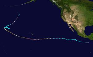 John's 31-day existence made the hurricane the longest-lasting tropical cyclone recorded in both the Pacific Ocean and worldwide, surpassing both Hurricane Tina's previous record in the Pacific of 24 days in the 1992 season and the 1899 San Ciriaco hurricane's previous world record of 28 days in the 1899 Atlantic season.[8] In addition, despite its slow movement throughout much of its path, John was the farthest-traveling tropical cyclone in both the Pacific Ocean and worldwide, with a distance traveled of 7,165 miles (13,280 km), out-distancing previous record holders Hurricane Fico in the Pacific of 4,700 miles (8,700 km) in the 1978 season and Hurricane Faith worldwide of 6,850 miles (12,700 km) in the 1966 Atlantic season.[9]