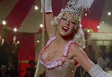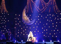 Aguilera first performed the song at the MTV Video Music Awards on August 31, 2006; James Montgomery from MTV News named it one of the "high-gloss" moments of the event.[46] Aguilera also promoted the song during the holiday season later that year, performing on the TV special Christmas at Rockefeller Center, aired by NBC on November 29, 2006.[47] She performed the song on German entertainment show Wetten, dass..?,[48] and on Saturday Night Live in 2006.[49] "Hurt" was included on the setlist of Aguilera's Back to Basics Tour in 2006 and 2007. For the performance of the song, she dressed in a plume outfit designed by Roberto Cavalli and sang while a giant crescent moon descended from the ceiling.[50] The performance recorded during Aguilera's show in Adelaide, Australia in 2007 was included on the Back to Basics: Live and Down Under DVD release.[51]