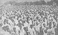 The meeting began around 2 pm though processions of Muslims from all parts of Calcutta had started assembling since the midday prayers. A large number of the participants were reported to have been armed with iron bars and lathis (bamboo sticks). The numbers attending were estimated by a Central Intelligence Officer's reporter at 30,000 and by a Special Branch Inspector of Calcutta Police at 500,000. The latter figure is impossibly high and the Star of India reporter put it at about 100,000. The main speakers were Khawaja Nazimuddin and Chief Minister Huseyn Shaheed Suhrawardy. Khwaja Nazimuddin in his speech preached peacefulness and restraint but spoilt the effect and flared up the tensions by stating that till 11 o'clock that morning all the injured persons were Muslims, and the Muslim community had only retaliated in self-defence.[18]