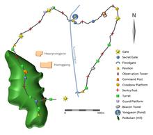 The structures of the wall can also be listed in the order they appear by walking the length of the wall, beginning with the South Gate.[8] or the "Asian Historical Architecture".[9] Here, these structures are listed in anti-clockwise order beginning by the South Gate (the access node using public transportation).