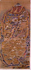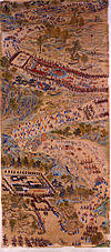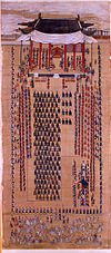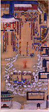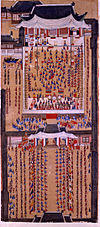 As usual, this Court event has been documented by the Royal Library, leading to the "Wonhaeng Eulmyo Jeongni Uigwe" (Eulmyo= 1795). As for each Uigwe, several "official copies" of this document have been realized (the main copy being more precious and reserved for the King's use). The main document of this Uigwe is an eight-panel screen: 화성행행도 병풍 Hwaseonghaenghaengdo Byeongpun. Nowadays, it existe three copies of this screen, a sepia one,[17] a blue one (see gallery below) and a color one,[18] the King's use copy. This last copy can be seen at Samsung Museum of Art Leeum and has been designated as Treasure 1430 in 2005-04-15.[19]