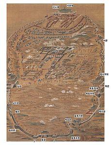 A comparison between these panels and a military map of the Fortress is interesting: the focus of the court painters seems more directed towards literati concerns (e.g.: where is Yongyeon and how to access this pond through Buknam-ammun ?) than towards military concerns (e.g. Dongjangdae has disappeared). One can also think about some kind of military 'non-disclosure' clause.