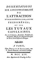 Jean-François Gerdil was born in 1718 at Samoëns in the Duchy of Savoy to Pierre Gerdil, a notary, and Françoise Perrier, a native of Taninges.[2] When 15 years old, he joined the Barnabites at Annecy, taking the name Hyacinthe Sigismond. He was sent to Bologna to pursue his theological studies; also having an interest in the sciences, he devoted his mind to the various branches of knowledge with great success. While he improved his command of Italian, he came the attention of Propero Lambertini, Archbishop of Bologna, later Pope Benedict XIV, who used the young seminarian to translate French texts.