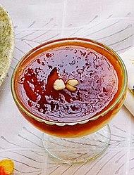 - Qubani ka meetha (Khubani-ka-Meetha) - Apricot Pudding, Toppings with almond and cream. The original recipe is a translucent liquid.