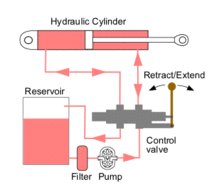 For the hydraulic fluid to do work, it must flow to the actuator and/or motors, then return to a reservoir. The fluid is then filtered and re-pumped. The path taken by hydraulic fluid is called a hydraulic circuit of which there are several types.