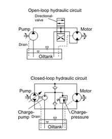 Closed-loop: Motor-return is connected directly to the pump-inlet. To keep up pressure on the low pressure side, the circuits have a charge pump (a small gearpump) that supplies cooled and filtered oil to the low pressure side. Closed-loop circuits are generally used for hydrostatic transmissions in mobile applications. Advantages: No directional valve and better response, the circuit can work with higher pressure. The pump swivel angle covers both positive and negative flow direction. Disadvantages: The pump cannot be utilized for any other hydraulic function in an easy way and cooling can be a problem due to limited exchange of oil flow. High power closed loop systems generally must have a 'flush-valve' assembled in the circuit in order to exchange much more flow than the basic leakage flow from the pump and the motor, for increased cooling and filtering. The flush valve is normally integrated in the motor housing to get a cooling effect for the oil that is rotating in the motor housing itself. The losses in the motor housing from rotating effects and losses in the ball bearings can be considerable as motor speeds will reach 4000-5000 rev/min or even more at maximum vehicle speed. The leakage flow as well as the extra flush flow must be supplied by the charge pump. A large charge pump is thus very important if the transmission is designed for high pressures and high motor speeds. High oil temperature is usually a major problem when using hydrostatic transmissions at high vehicle speeds for longer periods, for instance when transporting the machine from one work place to the other. High oil temperatures for long periods will drastically reduce the lifetime of the transmission. To keep down the oil temperature, the system pressure during transport must be lowered, meaning that the minimum displacement for the motor must be limited to a reasonable value. Circuit pressure during transport around 200-250 bar is recommended.