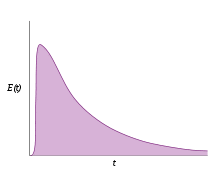 This method required the introduction of a very small volume of concentrated tracer at the inlet of the reactor, such that it approaches the Dirac delta function.[10][8] Although an infinitely short injection cannot be produced, it can be made much smaller than the mean residence time of the vessel. If a mass of tracer, , is introduced into a vessel of volume and an expected residence time of , the resulting curve of can be transformed into a dimensionless residence time distribution curve by the following relation: