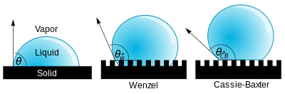 where φ is the area fraction of the solid that touches the liquid.[10] Liquid in the Cassie–Baxter state is more mobile than in the Wenzel state.
