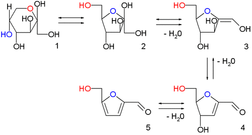 HMF was first reported in 1875 as an intermediate in the formation of levulinic acid from sugar and sulfuric acid.[14] This remains the classical route, with 6-carbon sugars (hexoses) such as fructose undergoing acid catalyzed poly-dehydration.[15][16] When hydrochloric acid is used 5-chloromethylfurfural is produced instead of HMF. Similar chemistry is seen with 5-carbon sugars (pentoses), which react with aqueous acid to form furfural.