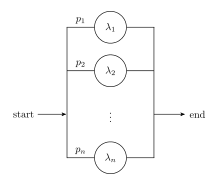 where each Yi is an exponentially distributed random variable with rate parameter λi, and pi is the probability that X will take on the form of the exponential distribution with rate λi.[1] It is named the hyperexponential distribution since its coefficient of variation is greater than that of the exponential distribution, whose coefficient of variation is 1, and the hypoexponential distribution, which has a coefficient of variation smaller than one. While the exponential distribution is the continuous analogue of the geometric distribution, the hyperexponential distribution is not analogous to the hypergeometric distribution. The hyperexponential distribution is an example of a mixture density.