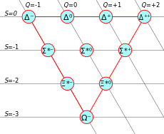 | Sigma resonance[10] | Σ∗− (1385) | d d s | 1 387.2(5) | 1 | 3&fras1;2+ | −1 | −1 | 0 | 0 | Λ + π or Σ + π | |