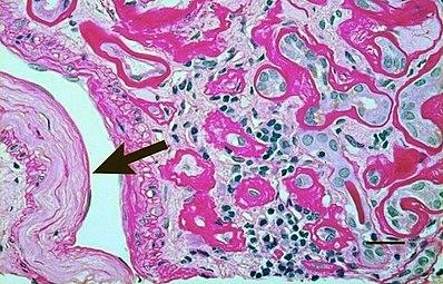 In the kidneys, as a result of benign arterial hypertension, hyaline (pink, amorphous, homogeneous material) accumulates in the walls of small arteries and arterioles, producing the thickening of their walls and the narrowing of the arterial openings, a process known as arteriolosclerosis. The resulting inadequate blood flow produces tubular atrophy, interstitial fibrosis, and glomerular alterations (smaller glomeruli with different degrees of hyalinization – from mild to sclerosis of glomeruli) and scarring around the glomeruli (periglomerular fibrosis). In advanced stages, kidney failure will occur. Functional nephrons[5] have dilated tubules, often with hyaline casts in the opening of the tubules. Additional complications often associated with hypertensive nephropathy include glomerular damage resulting in protein and blood in the urine.