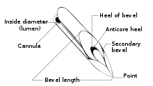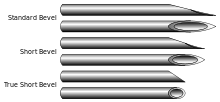 Hypodermic needles are normally made from a stainless-steel tube[18] through a process known as tube drawing where the tube is drawn through progressively smaller dies to make the needle. The end of the needle is bevelled to create a sharp pointed tip, letting the needle easily penetrate the skin.[19]