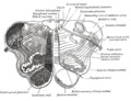 |  The cranial nerve nuclei schematically represented; dorsal view. Motor nuclei in red; sensory in blue. (XII labeled at bottom left.) | |