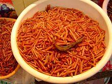 The larvae are one of the species used to put into mezcal.[4] In Spanish, they are known as chilocuil, chinicuil, or tecol and have been traditionally used as food in Mexican cuisine. The caterpillars are also known as gusanos rojos, giving its name to a popular brand of mezcal; they are one of the two kinds of "worms" placed in bottles of mezcal, giving a unique color and flavor to the drink. The other, less appreciated ones, are the larvae of the agave snout weevil, Scyphophorus acupunctatus.