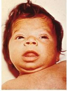 Newborn children with hypothyroidism may have normal birth weight and height (although the head may be larger than expected and the posterior fontanelle may be open). Some may have drowsiness, decreased muscle tone, a hoarse-sounding cry, feeding difficulties, constipation, an enlarged tongue, umbilical hernia, dry skin, a decreased body temperature, and jaundice.[21] A goiter is rare, although it may develop later in children who have a thyroid gland that does not produce functioning thyroid hormone.[21] A goiter may also develop in children growing up in areas with iodine deficiency.[22] Normal growth and development may be delayed, and not treating infants may lead to an intellectual impairment (IQ 6–15 points lower in severe cases). Other problems include the following: difficulty with large scale and fine motor skills and coordination, reduced muscle tone, squinting, decreased attention span, and delayed speaking.[21] Tooth eruption may be delayed.[23]