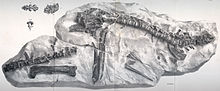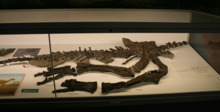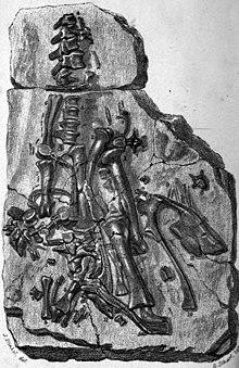 Later, the number of specimens was increased by Reginald Walter Hooley. In 1905, Baron Franz Nopcsa dedicated a study to Hypsilophodon,[14] and in 1936 William Elgin Swinton did the same,[15] on the occasion of the mounting of two restored skeletons in the British Museum of Natural History.[16] Most known Hypsilophodon specimens were discovered between 1849 and 1921 and are in the possession of the Natural History Museum that acquired the collections of Mantell, Fox, Hulke and Hooley. These represent about twenty individual animals. Apart from the holotype and paratype, the most significant specimens are: NHM R5829, the skeleton of a large animal; NHM R5830 and NHM R196/196a, both skeletons of juvenile animals; and NHM R2477, a block with a skull together with two separate vertebral columns.[17] Although this was the largest find, new ones continue to be made.[5]