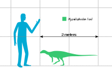 Hypsilophodon was a relatively small dinosaur, though not quite so small as, for example, Compsognathus. For Hypsilophodon often a maximum length of 2.3 metres is stated. This has its origin in a study of 1974 by Galton, in which he extrapolated a length of 2.28 metres based on specimen BMNH R 167, a thigh bone.[17] However, in 2009, Galton concluded that this femur in fact belonged to Valdosaurus and downsized Hypsilophodon to a maximum known length of 1.8 metres,[5] the largest specimen being NHM R5829 with a femur length of 202 millimetres.[17] Typical specimens are about 1.5 metres long. Hypsilophodon would have reached up to half a metre in height. In 2010, Gregory S. Paul estimated a weight of 20 kilograms (44 lb) for an animal two metres in length.[25]