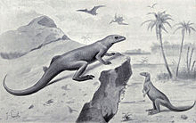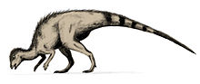 Early paleontologists modelled the body of this small, bipedal, herbivorous dinosaur in various ways. In 1882 Hulke suggested that Hypsilophodon was quadrupedal but also, in view of its grasping hand, able to climb rocks and trees in order to seek shelter.[13] In 1912 this line of thought was further pursued by Austrian paleontologist Othenio Abel. Concluding that the first toe of the foot could function as an opposable hallux, Abel stated that Hypsilophodon was a fully arboreal animal and even that an arboreal lifestyle was primitive for the dinosaurs as a whole.[31] Though this hypothesis was doubted by Nopcsa,[32] it was adopted by the Danish researcher Gerhard Heilmann who in 1916 proposed that a quadrupedal Hypsilophodon lived like the modern tree-kangaroo Dendrolagus.[33] In 1926 Heilmann had again changed his mind, denying that the first toe was opposable because the first metatarsal was firmly connected to the second,[34] but in 1927 Abel refused to accept this.[35] In this he was in 1936 supported by Swinton who claimed that even a forward pointing first metatarsal might carry a movable toe.[15] As Swinton was a very influential populariser of dinosaurs, this remained the accepted view for over three decades, most books typically illustrating Hypsilophodon sitting on a tree branch. However, Peter M. Galton in 1969 performed a more accurate analysis of the musculo-skeletal structure, showing that the body posture was horizontal.[36] In 1971 Galton in detail refuted Abel's arguments, showing that the first toe had been incorrectly reconstructed and that neither the curvature of the claws, nor the level of mobility of the shoulder girdle or the tail could be seen as adaptations for climbing,[37] concluding that Hypsilophodon was a bipedal running form.[38] This convinced the paleontological community that Hypsilophodon remained firmly on the ground.