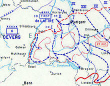 From Freudenstadt, elements of the 1re DB pushed east and south, capturing Ulm on April 24, and then pushed south again with elements of the 2e DIM into the Alps, crossing into Austria and marching into Sankt-Anton on May 7, 1945. Elements of the 5e DB and the 4e DMM drove southeast along the north shore of Lake Constance, capturing Bregenz and then turning east toward Sankt-Anton. The following day was VE Day, ending Allied military operations in Europe.