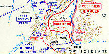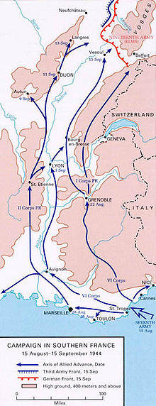 The battle cut off the German 308. Grenadier-Regiment on November 24, forcing the German troops to either surrender or intern themselves in Switzerland. On November 25, 1st Army Corps units liberated both Mulhouse (taken by a surprise armored drive) and Belfort (taken by assault of the 2e DIM). Realizing the German defense had been too static for their own good, General De Lattre (commander of the French First Army) directed both corps of his army to close on Burnhaupt in order to encircle the German LXIII. Armeekorps (the former IV. Luftwaffe Korps). This maneuver succeeded on November 28, 1944, and resulted in the capture of over 10,000 German troops, crippling the LXIII. Armeekorps.[24] French losses, however, had also been significant, and plans to immediately clear the Alsatian Plain of German forces had to be shelved while both sides gathered strength for the next battles.