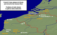 With the German invasion violating the neutrality of Belgium and the Netherlands on May 10, 1940, the 1st Army Corps moved into Belgium with the goal of gaining contact with the Dutch Army. This was achieved on May 12 near Breda, but the general failure of the Allies to hold the German advance mandated early retreats so that the 1st Army Corps would not be cut off. Breda fell to the Germans on May 13 and the corps conducted a fighting withdrawal through Dorp and Wuustwezel to the fortified zone of Antwerp, Belgium. During May 15–17, the corps defended the Scheldt Estuary with the 60th and 21st Infantry Divisions (60e DI and 21e DI), but was ordered to retreat back into France on May 18.[6]