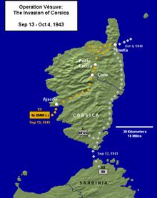 While British and American troops invaded mainland Italy in September 1943, the 1st Army Corps, comprising Headquarters, 4th Moroccan Mountain Division (4e DMM), the 1st Regiment of Moroccan Tirailleurs (1er RTM), the 4th Regiment of Moroccan Spahis (4e RSM) (light tank), the 2nd Group of Moroccan Tabors (2e GTM), the Commandos de Choc battalion and the 3rd Battalion, 69th Mountain Artillery Regiment (69e RAM),[11] landed on the island of Corsica in the same month. To the south, the German 90. Panzergrenadier-Division and the Reichsführer-SS assault infantry brigade were evacuating Sardinia and landing on the southern coast of Corsica. Wishing to cut off the German troops, and informed on September 10, 1943, that the Italian troops on Corsica were willing to fight on the side of the Allies, the French launched Operation Vésuve and landed elements of the 1st Army Corps at Ajaccio on September 13, meeting Corsican partisans who also wanted enemy troops off the island.