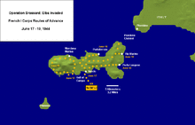 At 0400 hours on June 17, 1944, the 1st Army Corps assaulted Elba in Operation Brassard. French forces comprised the 9th Colonial Infantry Division (9e DIC), two battalions of French commandos (Commandos d'Afrique and Commandos de Choc), a battalion and supplementary battery of the Colonial Artillery Regiment of Morocco (R.A.C.M.) and the 2nd Group of Moroccan Tabors (2e GTM), in addition to 48 men from "A" and "O" commandos of the Royal Navy.[19] French Choc (lightly armed fighters who had the mission of operating behind enemy lines) units landed at multiple points before the main landing force and neutralized coastal artillery batteries. Landing in the Gulf of Campo on the south coast, the French initially ran into difficulties because of the German fortifications and extremely rugged terrain that ringed the landing area. Falling back on an alternate plan, the landing beach was shifted to the east, near Nercio, and here the troops of the 9th Colonial Infantry Division seized a viable beachhead. Within two hours, French commandos reached the crest of the 400-meter Monte Tambone Ridge overlooking the landing areas. The RN commandos boarded and seized the German Flak ship Köln and also landed to guide in other troops headed for the beaches, but a massive blast from a German demolition charge killed 38 of their men. Portoferraio was taken by the 9th Division on June 18 and the island was largely secured by the following day. Fighting in the hills between the Germans and the Senegalese colonial infantry was vicious, with the Senegalese employing flamethrowers to clear entrenched German troops.[20]