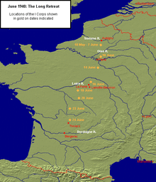 After the Germans crossed the Loire River on June 18, the 19e DI of the corps was largely destroyed near La Ferté. This was followed by capture of the bulk of the infantry of the 29th (29e DI) and 47th Infantry Divisions (47e DI) on June 19 near Lamotte-Beuvron.[8] The final week of the campaign was a constant retreat for the remnants of the corps, with elements crossing the Dordogne River near Bergerac on June 24, 1940. The following day, an armistice was declared and the corps assembled in the region of Miallet and Thiviers.