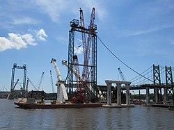 The new bridge will be just upstream of the existing bridge and will be a basket-handle, true-arch twin bridge with four lanes in each direction and a pedestrian/bicycle path. A ground-breaking ceremony for the new bridge was held on June 26, 2017. The westbound bridge is expected to be completed in late 2019 and the eastbound span is expected to be completed in late 2020.[5] The existing I-74 bridge is anticipated to be removed in 2021. Winter weather conditions and the resulting high water over an extended period of time, however, have created delays and the opening of the first span has been pushed to the first half of 2020. On November 13, 2020, the Iowa-bound side of the new bridge opened to motorists.[6]East-bound lanes of the new bridge are expected to open by the end of the year 2020.