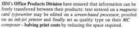 In 1966, IBM released the Selectric Composer.[7] This highly modified (and much more expensive) Selectric produced camera-ready justified copy using proportional fonts in a variety of font styles from eight points to fourteen points.[8] Material prepared on a properly adjusted machine by a skillful operator and printed onto baryta (barium sulfate-coated) paper "would take an expert to tell ... [that it] was not the product of a Linotype or Monotype machine".[9]